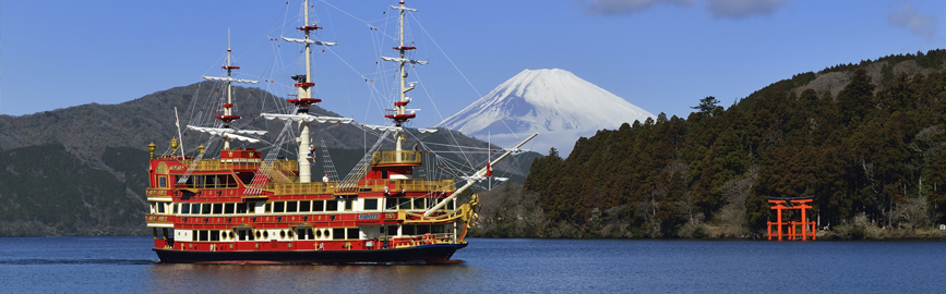 箱根ビジターセンターからすぐの桃源台、もしくは湖尻から乗船し、遊覧船で芦ノ湖を渡ります。湖上からの富士山、駒ヶ岳を見上げる眺めもまた格別です。芦ノ湖の船旅は箱根ならではの体験です。特に紅葉の時期、新緑の時期がおすすめ。