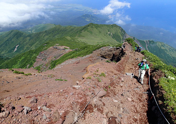 北岸の鴛泊と西岸の沓形からの2つの登山コースがあります。洋上の独立峰ならではの海をバックにしたダイナミックな登山を楽しむことができ、上部では高山植物のお花畑を楽しむことができます。