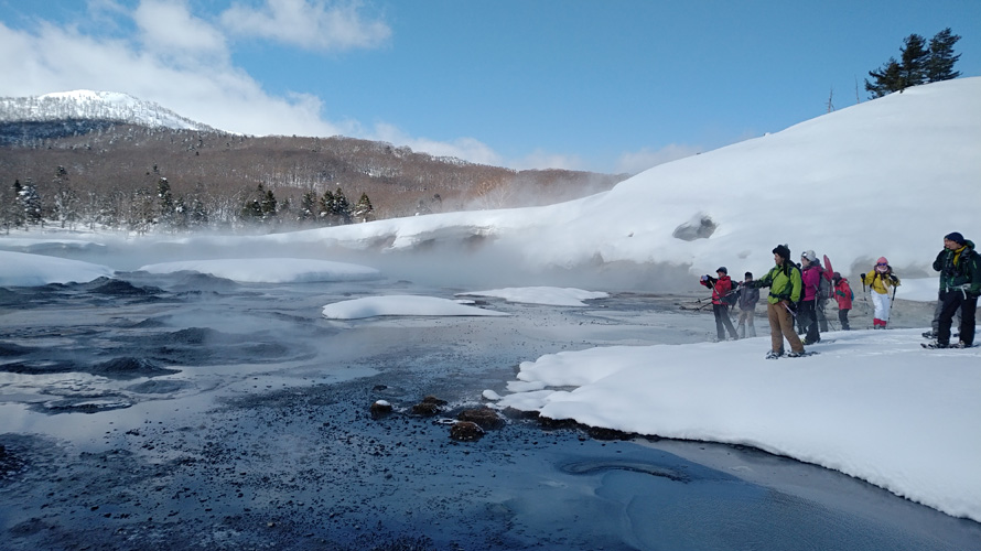 初心者にも簡単なスノーシューを履いて、ブナ林の中を歩くツアーです。ガイドの案内で、動物たちの足跡や野鳥を観察しながら冬の自然を満喫できます。ふかふかの新雪を歩く楽しみがあります。