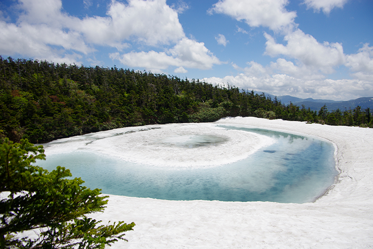 残雪の白と沼の青のコントラスト「”ドラゴンアイ”と雪解けの湖沼群」