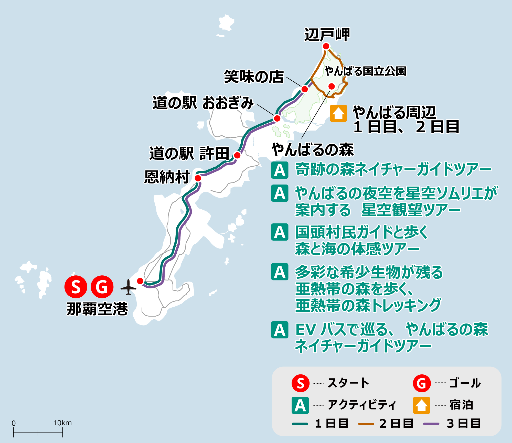 生物多様性にあふれるやんばるの森”の魅力や不思議を体験し、国立公園や世界自然遺産として価値に気づかせてくれるネイチャーガイドツアーから始まり、日本で5番目の星空保護区を目指す国頭村の森林公園での星空観察や地元ガイドが案内するやんばるの山と海の暮らしなど、豊かな森とそれらの恵みを享受する人々の生活など、様々な角度から『やんばるの森』を知ることで、唯一無二の場所であることを体感することができるコースです。