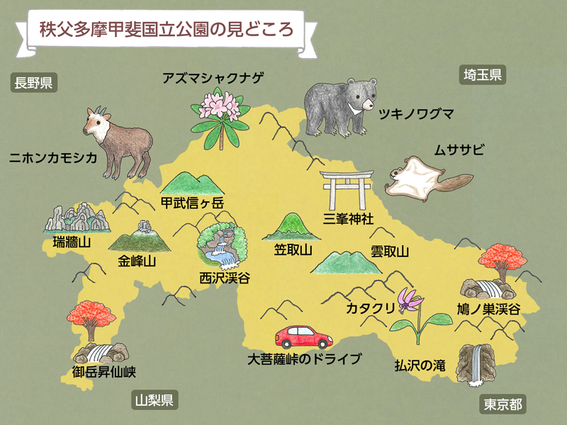 千曲川、笛吹川、荒川の源流域であり、甲斐、武蔵、信濃にまたがることが名前の由来と言われています。深い原生林に包まれた山で、6月にはシャクナゲが咲き乱れます。