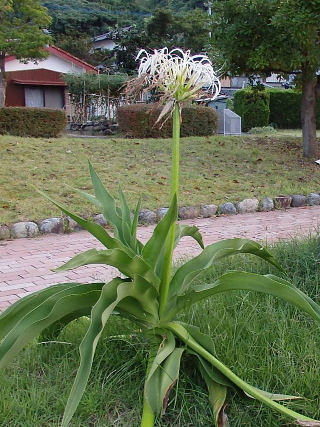 ヒガンバナの仲間で、海岸部に生育します。オモトという植物に似ていることからも「ハマオモト」と呼ばれます。花の様子が、神道神事で用いる白い布(ゆう)と似ていることから、「ハマユウ」と呼ばれることもあります。