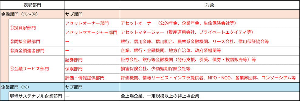 金融部門では、ビジネスモデルを持続可能なものへと移行することを支え、環境・社会・経済に対してインパクトを与える取組を促進する投資家、金融機関、金融サービス事業者及びそれら資金を活用する資金調達者について、企業規模に関わらずインベストメント・チェーンにおける役割に応じた優れた組織や先進的な取組、他の模範となるような取組などを評価・表彰します。