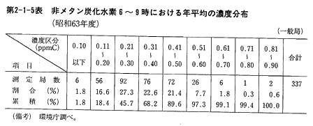 昭和63年度における非メタン炭化水素の測定データは、233市町村、337測定局で得られている。6〜9時における平均値の年平均値の濃度分布は第2-1-5表のとおりである。