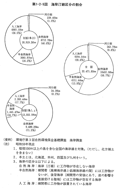 我が国の総海岸線は、昭和59年に実施した調査によれば32,472?であり、本土域海岸がその58.3%を占め、島しょ域海岸が41.7%を占める。なお、総海岸線は埋め立ての結果前回53年調査に比べ若干増加している。海岸の区分比は、総海岸線でみると、自然海岸が56.7%を占め、人工海岸が28.6%、半自然海岸が13.9%と続いている。島しょ部を除く本土部のみで比較すると、自然海岸の占める割合が46.0%、人工海岸の割合が36.5%である(第1-2-5図)。昭和53年から59年までの変化を見ると、自然海岸が565?減少し、人工海岸が696?、半自然海岸が171?増加している。この増減の内訳をみると、砂浜、岩石海岸が減少し、埋め立て海岸が増加している(第1-2-6図)。
