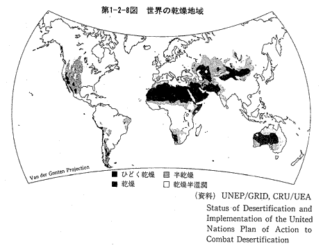 世界には61億ha以上の乾燥地が存在し、地球の陸地の40%近くを占める。そのうち9億haが極めて乾燥している地域で、いわゆる砂漠である。残りの52億haの一部が人間活動の結果、砂漠化している。こうした乾燥地域で世界人口の約5分の1の人々が居住し、生活を営んでいる。1991年にUNEPが行なった評価によると、乾燥地域における農地の69.0%、35億6,217万haが乾燥化により影響を受けている。その内訳は、灌漑地の劣化が4,315万ha、これは乾燥地における総灌漑農地の30%を占める。同じく雨水に依存する耕作地の47%に当たる2億1,556万ha、さらに牧畜地の73%に当たる33億3,346万haで砂漠化が進行している。地域別にみると、劣化している割合が高いのは、北アメリカ、アフリカ、南アメリカの順であるが、面積で見るとアジアが最も多く、アフリカがそれに次ぐ(第1-2-8図)。