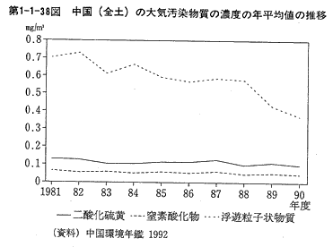 中国では、環境基準を、一級基準、二級基準、三級基準の3つの地域に分けて設定している。1990年(平成2年)の各物質の全国の年平均値の環境基準との適合状況を見ると、二酸化硫貫、浮遊粒子状物質はいずれも居住地域に適用される二級基準を超えているが、窒素酸化物は二級基準に適合している。