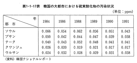 、0.015-0.023ppmに相当)を超えている都市もあり、汚染は深刻である(第1-1-17表)。なお、韓国等で排出される硫黄酸化物については、現在、環日本海における移流状況について調査が進められている。