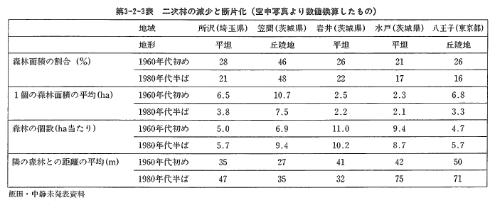 また、森林面積の減少とともに、森林の断片化が生じている。第3-2-3表は関東地方で今でも比較的雑木林の残っている埼玉県所沢市等の5か所について断片化の状況を見たものである。1960年代初めと1980年代半ばを比べると、単位面積当たりの森林面積の割合及び1個の森林面積の平均が減少しているのに対し、森林の個数及び隣接する森林との平均距離が増大している地域が多く、森林の断片化が進んだことが分かる。第3-2-1図からは所沢における二次林の断片化が進んだ様子を視覚的にとらえることが可能である。雑木林に限らず、生息地の断片化は、生息地面積の減少、他の同種の生息地との連絡の遮断、外部の空間との接触の増大等を通じてその生態系に影響を及ぼす。生息地面積の減少は、オオタカのような多くのえさを必要とする上位の捕食者の生息を不可能にし、生息地の連絡の遮断は他の生息地からの種の補充を困難にすることにより種の消滅の可能性を増す。また、外部空間との接触の増大は本来、雑木林の周辺部にのみ生息する生物や植生の雑木林内部への侵入を招くことにより、生態系の改変をもたらす。