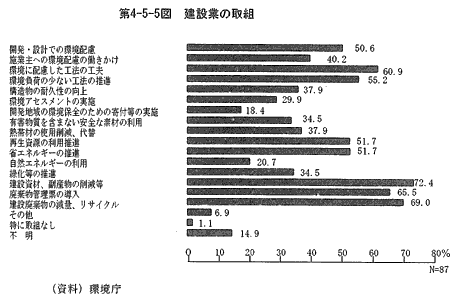 建設業での具体的な取組は、「建設資材及び建設副産物の削減、リサイクル及び適正処理」(72.4%)、「建設廃棄物の減量、リサイクル」(69.0%)等の廃棄物減量化等の取組、「環境に配慮した工法の工夫」(60.9%)、「開発・設計に当たり自然環境や都市環境に極力配慮」(50.6%)等の開発・設計及び工法等での環境配慮のほか、「再生資源の利用促進」(51.7%)や「省エネルギーの推進」(51.7%)、「熱帯材の使用削減、代替」(37.9%)等の取組が行われている(第4-5-5図)。