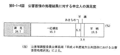 平成4年度において、公害苦情の申立てから解決(処理済み)までに要した期間をみると、1か月以内に74.7%と約4分の3が解決されており、解決した結果に対する申立人の満足度は、「満足」が26.7%、「一応満足」が45.3%となっており、両者を合わせると72.0%となり、申立人の約4分の3がその結果に満足していることとなる。(第6-1-3図、第6-1-4図)。