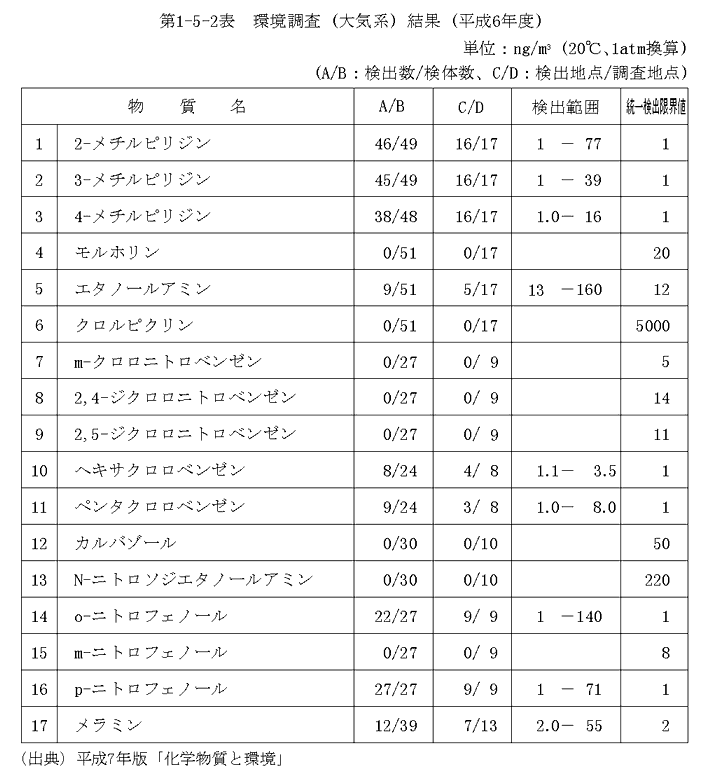 今回の調査の結果、17物質中9物質(2-メチルピリジン、3-メチルピリジン、4-メチルピリジン、エタノールアミン、ヘキサクロロベンゼン、ペンタクロロベンゼン、o-ニトロフェノール、p-ニトロフェノール、メラミン)が検出された。特にメチルピリジン類、ニトロフェノール類で検出頻度が高かった。検出された物質については、今後一定期間をおいて環境調査を行い、その推移を監視することが必要と考えられる(第1-5-2表)。