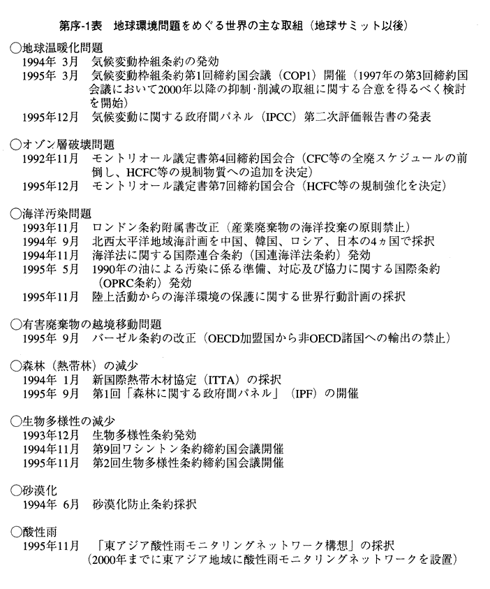 この間、国際社会においては各分野において様々な取組が進められ、一定の成果が見られる分野もある(第序-1表)。我が国においても、アジェンダ21行動計画の策定、環境基本法の制定、環境基本計画の策定と、持続可能な社会の構築に向けての枠組みづくりをはじめとして、各分野での取組が進められている。