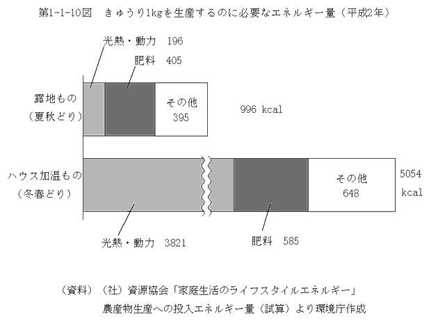 また、食生活の変化が、一面では環境への負荷を増大させてきていることも指摘できる。例えば、施設栽培については、加温設備があるのが約3割であり、省エネルギー化も進められていることから、施設栽培の割合の高まりをそのまま環境への負荷の増大と考えるわけにはいかないが、(社)資源協会の試算結果によれば、生産に要するエネルギー量を比べると、夏秋どりの露地栽培ものと冬春どりのハウス加温栽培ものでは、相当の開きがある(第1-1-10図)。また、農作物の生産のためにビニールハウスその他で用いられたビニールの廃棄も大きな問題となっている。
