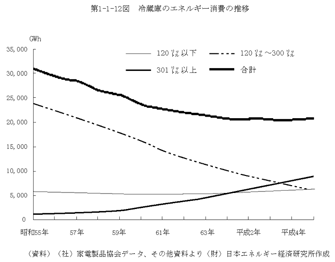 さらに、調理や保存のための家電製品の普及は食生活の内容の変化と並行して進み、現在、冷蔵庫、炊飯器の普及率はほぼ100%、電子レンジについても80%を越えている。これらの家電製品の普及は、食生活の向上及び家事労働の軽減に大きく貢献した点で評価されるが、環境面からは、特に保存に係る機器を中心に負荷を増大させてきたものと考えられる。さらに、近年、より大型かつ多機能の製品が選択される傾向にあり、このような傾向は一台当たりのエネルギー消費効率等の改善を打ち消す方向に働いているものと推察される(第1-1-12図)。
