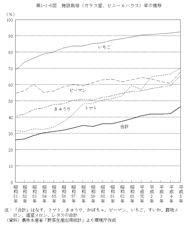 まず、「旬」の希薄化を野菜を例に見てみよう。第1-1-5図は東京都中央卸売市場におけるトマト、きゅうり、かぼちゃの入荷量の季節的変化を昭和40年と平成6年について示したものであるが、一見して季節感が薄れてきたことが分かる。昭和40年には、いずれの野菜も特定の月を頂点として入荷量が急峻な山型を見せていたのが、平成6年には山型が緩やかになり、入荷量の一番少ない月でも一番多い月の半分程度は確保されるようになっている。年間を通じた食材の供給が可能となった背景には、ビニールハウスなどの施設栽培の増加や海外からの輸入も含めた食品供給地の拡大がある。露地栽培を含めた全生産量に施設栽培(ガラス室及びハウス)が占める割合の推移を見ると、昭和51年時点で既にトマトが32%、きゅうりが41%、いちごが69%等となっていたのが、平成5年にはそれぞれ、70%、64%、93%と施設栽培の割合が急激に高まっている(第1-1-6図)。