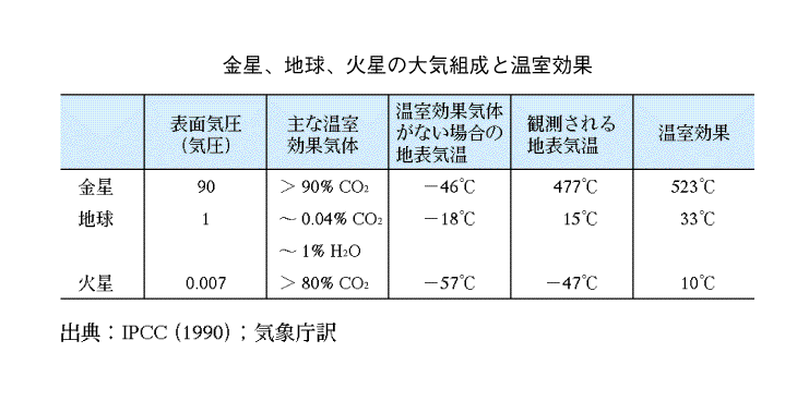 地球の温室効果が33℃であるのに対し、高圧の温室効果ガスがある金星では、温室効果は523℃に達し、温室効果ガスの少ない火星では温室効果は10℃となっている。
