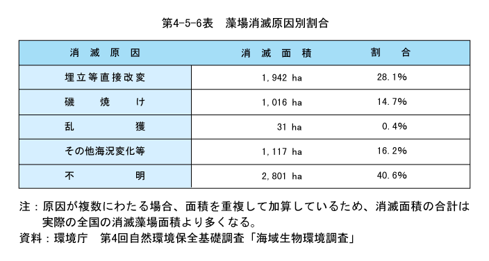 藻場の調査は、日本沿岸全域を対象に行われた。調査の結果、全国で201,212haの藻場が把握され、昭和53年の第2回調査以降6,403haの藻場の消滅が判明した。ひと続きで最大の藻場は、静岡県の相良から御前崎に位置する藻場で、7,891haであった。また、連続したものではないが、最も多くの藻場が分布するのは能登半島周辺の海域で、14,761ha(全国の7.3%)であった(第4-5-5表)。藻場の消滅の原因の上位は埋立、磯焼けが占めている(第4-5-6表)。磯焼けは、多くの場合原因が特定できないが、現象としてはよく繁茂していた大型海藻が枯死消失し、その後無節石灰藻類が繁殖し大型藻が生えなくなる現象である。いったん無節石灰藻の被覆が出来てしまうと、その状態は数年から十数年にわたって持続する例が知られている。
