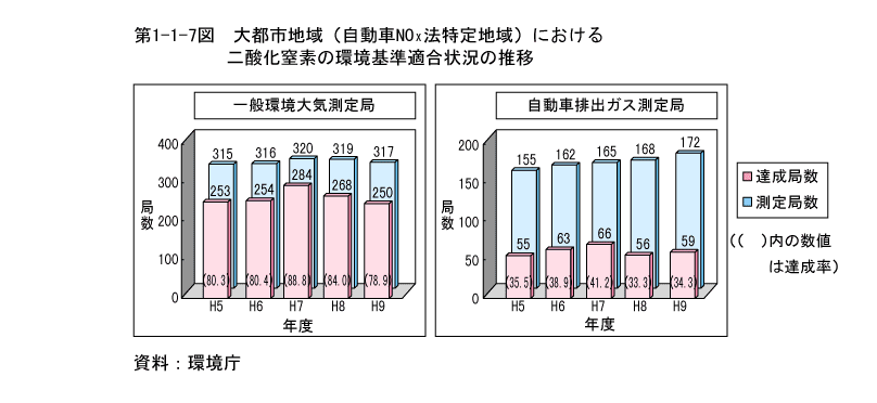 1日平均値の年間98%値が環境基準のゾーンの上限である0.06ppm以下の測定局(環境基準達成局)についてみると、平成9年度は、一般局95.3%、自排局65.7%となっており、その割合は平成8年度とほぼ同じであり、大都市地域を中心として環境基準の達成状況は依然低い水準で推移している。