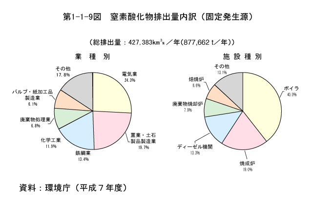 平成7年度における固定発生源からの窒素酸化物総排出量は、年間427,383千m