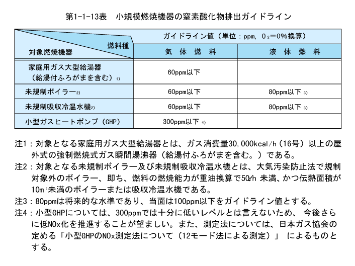 大気汚染防止法で規定する「ばい煙発生施設」に該当しない業務用小型ボイラー等の小規模燃焼機器については、特に大都市地域ではこれらから排出される窒素酸化物の量が無視できないことから、優良品推奨水準としての窒素酸化物排出濃度に係るガイドライン値(第1-1-13表 )を定め、それに適合する低NOx型燃焼機器の普及啓発等を行っている。