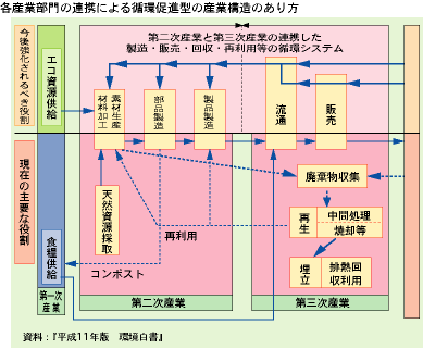 持続可能な経済社会の発展を考えるとき、これに大きな影響を及ぼす産業部門においても環境保全を内在化させるための構造的な変革が求められる。昨年の環境白書では、第一次から第三次までの産業が、以下のような役割を今後強化することにより個々に持続可能性を高めていくとともに、相互にバランスをとりつつ連携を強め、全体として「循環促進型の産業構造」を形成していく必要があることを述べた。