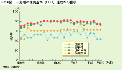 閉鎖性海域の水質改善には、その海域に流入する汚濁負荷量の削減が肝要であるため、水質総量規制が制度化されている。総量規制制度では、現行の排水基準では環境基準の達成が困難な海域として東京湾、伊勢湾及び瀬戸内海を指定し、CODの削減を目指している。平成10年度の環境基準(COD)の達成率を見ると、東京湾63%、伊勢湾44%、瀬戸内海76%となっている(3-2-6図)。