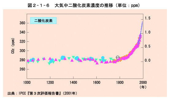 第一に、フローが大きすぎるため環境による浄化や資源の再生産が追いつかないという量的な問題があります。大気中の二酸化炭素濃度は、産業革命以前は280ppmv*だったと考えられています。しかし化石燃料の使用や森林の伐採で大量の二酸化炭素が大気中に放出されたことにより、1999年には367ppmvまで上昇しました(図2-1-6)。