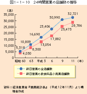 今日の私たちのライフスタイルは、大量生産、大量消費、大量廃棄型の社会経済システムの下、生活水準の上昇と生活の利便性の向上を追求したものとなっており、自動車保有台数の増加、家電製品の世帯当たりの所有台数の増加等に見られるように、エネルギーや資源の消費といった面で環境負荷を増大させています。また、携帯できる情報通信端末の増加(図1-1-9)などに見られるような機器の個人所有化、24時間対応の店舗やサービスの増加(図1-1-10)に見られる生活の24時間化などは、日常生活からの環境負荷を増大させるおそれを有しています。他方で、労働時間の減少、余暇時間の増大を背景として、自然とのふれあいへの志向やボランティア活動への参加志向が強まる傾向も見られ、こうした傾向は、環境保全のための取組への意識を高める可能性を有しています。