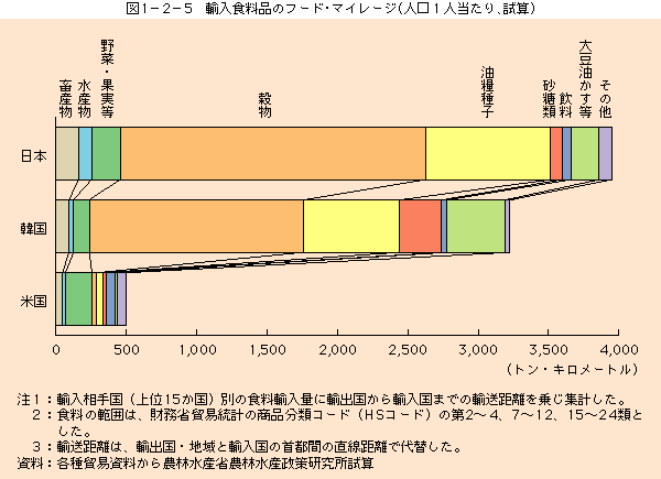 英国の消費者運動家(ティム・ラング氏)が、食料の生産地から食卓までの距離に着目し、なるべく近くで取れた食料を食べた方が輸送に伴う環境汚染が少なくなるという考え方に立って、1994年(平成6年)から「フード・マイル」という概念を提唱しています。この概念を参考にして、輸入食料品について「フード・マイレージ(単位:トン・キロメートル=輸入相手国別の食料輸入量×輸出国から輸入国までの輸送距離)」という指標を用いて試算すると、わが国のフード・マイレージは約5千億トン・キロメートル(平成12年)となっており、人口1人当たりで見ると、韓国の約1.2倍、米国の約8.0倍となっています(図1-2-5)。食料自給率の低いわが国では、食料の輸入による環境負荷は諸外国に比べて大きく、また、輸入量の増加とともに大きくなっています。