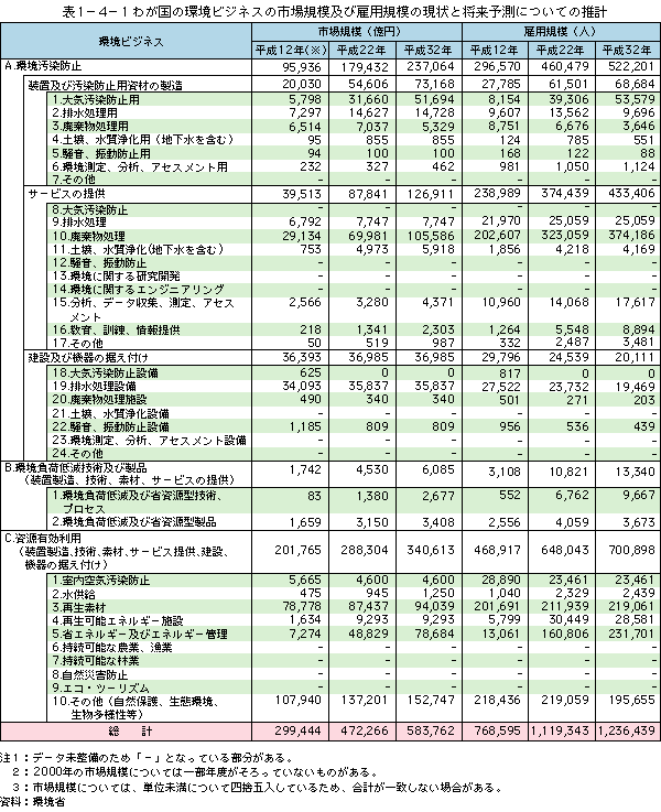 環境省が平成14年度に行った推計によれば、平成12年現在、環境ビジネス*の市場規模は29兆9千億円、平成22年には、47兆2千億円、さらに、平成32年には58兆4千億円に達すると見込まれています。この間、雇用規模は76万9千人から、平成22年には、111万9千人、平成32年には、123万6千人に増加するという推計が行われています(表1-4-1)。