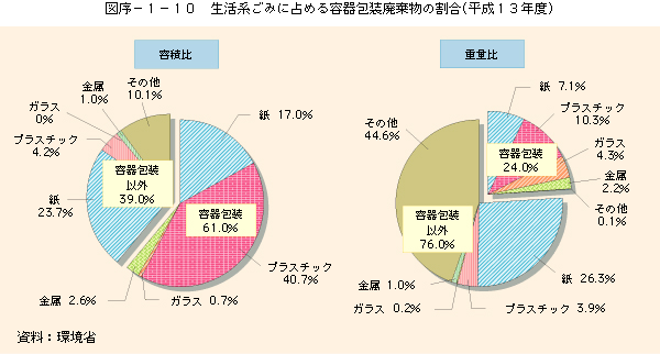 くらしから、多くのごみが排出されています。平成13年度のごみの総排出量は5,210万トン、国民1人当たりで1日に約1.1kgでした。このうち、生活系ごみが約67%、事業系ごみが約33%で、生活系ごみのうち、容器包装が容積比の約61%、湿重量比の約24%を占めています(図序-1-10)。