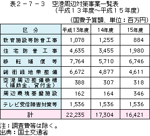 発生源対策を実施してもなお航空機騒音の影響が及ぶ地域については、「公共用飛行場周辺における航空機騒音による障害の防止等に関する法律」(昭和42年法律第110号)等に基づき空港周辺対策を行っています。同法に基づく対策を実施する特定飛行場は、東京国際、大阪国際、福岡等15空港であり、これらの空港周辺において、学校、病院、住宅等の防音工事及び共同利用施設整備の助成、移転補償、緩衝緑地帯の整備、テレビ受信料の助成等を行っています(表2-7-3)。