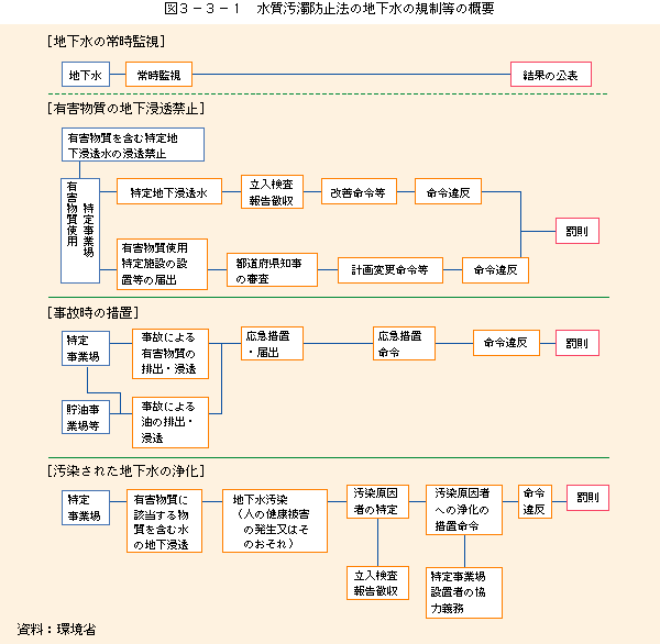 地下水汚染の未然防止対策については、水質汚濁防止法に基づき、トリクロロエチレン等有害物質を含む水の地下への浸透の禁止、都道府県知事による地下水の水質の常時監視等の措置がとられています。また、汚染された地下水の浄化のためには、水質汚濁防止法により、都道府県知事が汚染原因者に対し汚染された地下水の浄化を命令することができることとなっています(図3-3-1)。また、簡易で経済的な地下水浄化技術の開発・普及を図ることにより、事業者の自主的な取組を推進しました。