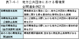 地方公共団体においては、環境保全に関連した条例等の下、地域の特性に応じたさまざまな施策が実施されました。地方公共団体の環境保全関連条例は表7-4-1のとおり4つに大別され、平成16年4月1日現在、都道府県・政令指定都市のうち、1)は59団体、2)は51団体、3)は55団体が制定しています。