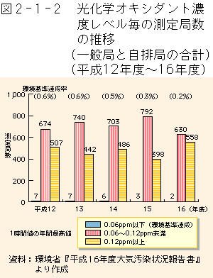 光化学オキシダントに係る環境基準(1時間値が0.06ppm以下であること)の達成状況は、極めて低く、一般局と自排局を合わせて、昼間(午前5時〜午後8時)に環境基準を達成した測定局及び1時間値の最高値が0.12ppm(光化学オキシダント注意報レベル)未満であった測定局数は、図2-1-2のとおりです。