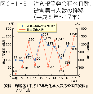 平成17年の光化学オキシダント注意報の発令延べ日数(都道府県を一つの単位として注意報等の発令日数を集計したもの)は185日(21都府県)で、16年の189日(22都府県)と比べ、わずかに減少しました(図2-1-3)。その発令延日数を月別にみると、7月が最も多く68日、次いで9月が44日でした。また、光化学大気汚染によると思われる被害届出人数(自覚症状による自主的な届出による。)は1,495人でした。