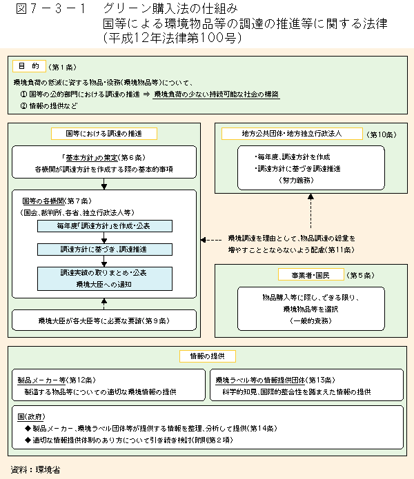 国等による環境物品等の調達の推進等に関する法律(平成12年法律第100号。以下「グリーン購入法」という。)は、国等の各機関(国や独立行政法人等の公的機関)による環境物品等(環境への負荷の低減に資する物品又は役務)の調達の推進、情報提供の充実などにより、環境物品等への需要転換を促進することを目的としています。