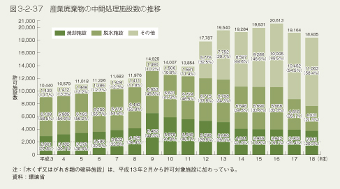 産業廃棄物の中間処理施設は焼却、破砕、脱水等を行う施設で、平成18年度末の許可施設数は、全国で18,935施設となっており、前年度との比較では1.2%の減少となっています。中間処理施設のうち汚泥の脱水施設が21.3%、木くず又はがれき類の破砕施設が45.1%、その他の焼却施設が7.9%を占めています(図3-2-37)。
