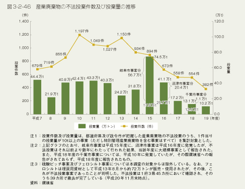 平成19年度に新たに報告のあった産業廃棄物の不法投棄事案は、382件(前年度554件)10.2万トン(同13.1万トン)で、件数・トン数ともに前年度より減少しました(図3-2-46)。