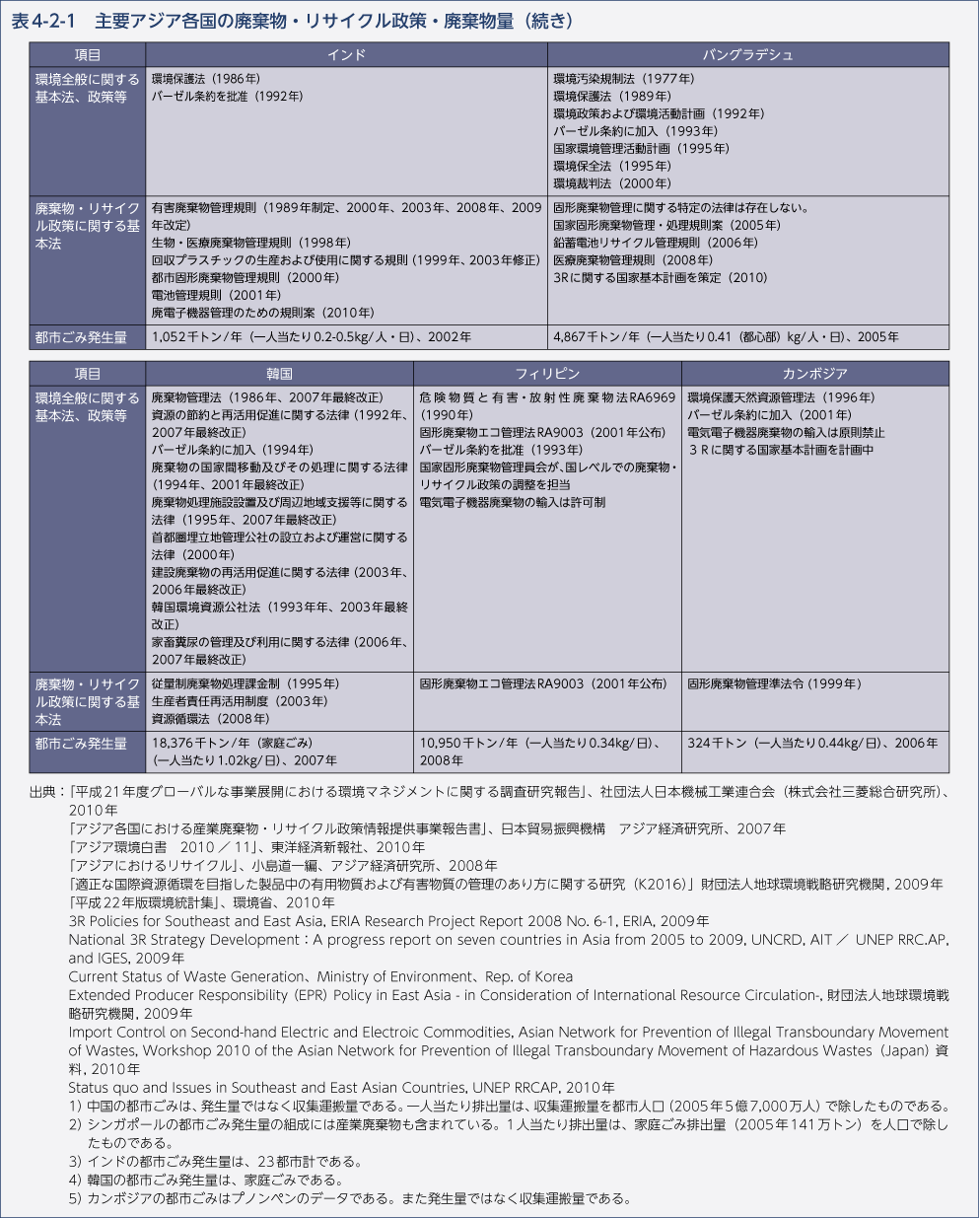 そこで、本節では、廃棄物・リサイクル分野におけるこれまでの我が国の経験及びその時々で獲得し、発展させてきた社会システム、技術、ライフスタイルなどの取組を世界の廃棄物問題の解決に役立てるための視点から、アジアを始めとする世界の廃棄物・リサイクル事情及びニーズを概観し、今日の我が国が有している経験を海外において活用する道筋を展望します。
