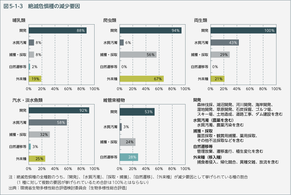 ○損失の要因としては、「第1の危機(開発・改変、直接的利用、水質汚濁)」による影響が最も大きいが、現在、新たな損失が生じる速度はやや緩和されている(図5-1-3)。「第2の危機(里地里山等の利用・管理の縮小)」は、現在もなお増大している。「第3の危機(外来種、化学物質)」のうち、特に外来種による影響が顕著である(図5-1-4)。「地球温暖化の危機」は、特に一部の脆弱な生態系で影響が懸念されている。これらの危機に対してさまざまな対策が進められ、一定の効果を上げてきたと考えられるが、間接的な要因として作用しているわが国の社会経済の大きな変化の前には、必ずしも十分といえる効果を発揮できていない。