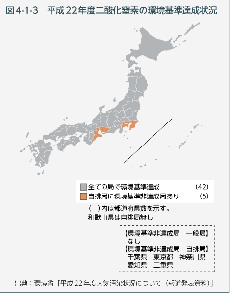 また、平成22年度に環境基準が達成されなかった測定局の分布をみると、自排局は自動車から排出される窒素酸化物及び粒子状物質の特定地域における総量の削減等に関する特別措置法(平成4年法律第70号。以下「自動車NOx・PM法」という。)の対策地域のうち埼玉県、大阪府及び兵庫県を除く5都県(千葉県、東京都、神奈川県、愛知県、三重県)に分布しています(図4-1-3)。
