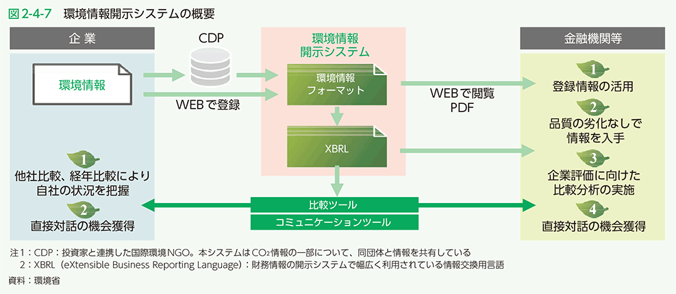 こうした中、その判断の情報源である企業の非財務情報の開示を各国が後押しする動きが活発化していますが、一般にこうした情報は入手や比較が困難という課題を抱えており、ESG投資を推進する上で大きな阻害要因の一つと懸念されています。そこで環境省では、世界に先駆け、環境情報を中心とした非財務情報の開示システムの開発に着手して運用する事業を実施しています(図2-4-7)。平成27年度に実施した実証試験では、国内外の企業・投資家等合わせて約300の主体が参加し、両者間で活発な対話が行われました。