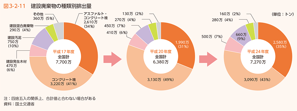 また、建設廃棄物の排出量のうち、建設工事に係る資材の再資源化等に関する法律(平成12年法律第104号。以下「建設リサイクル法」という。)で、一定規模以上の工事について再資源化等を義務付けているコンクリート塊、アスファルト・コンクリート塊及び建設発生木材が占める割合は約8割であるため、その3品目の再資源化をまず実施することが必要です(図3-2-11)。