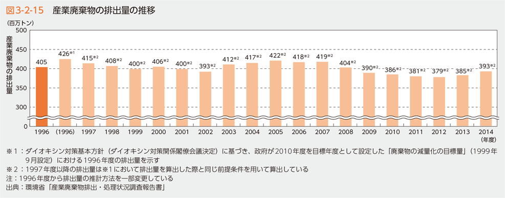 1995年度以降の産業廃棄物の排出量の状況は、図3-2-15のとおりです。