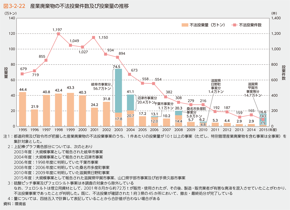 産業廃棄物の不法投棄件数及び投棄量、不適正処理件数及び不適正処理量の推移は、図3-2-22、図3-2-23のとおりです。また、2015年度に新たに判明したと報告があった5,000トン以上の大規模な不法投棄事案は3件、不適正処理事案は4件でした。