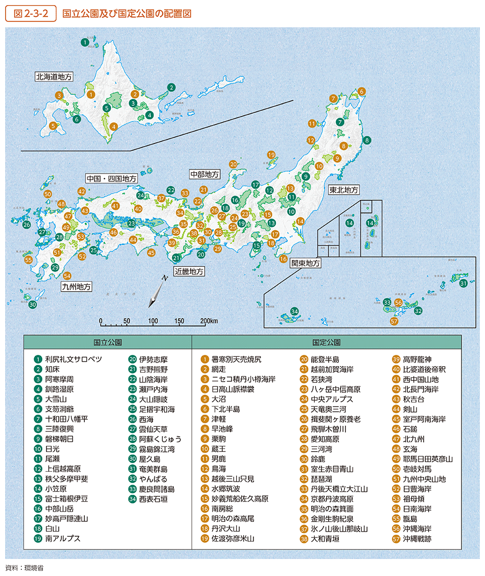 自然公園法(昭和32年法律第161号)に基づいて指定される自然公園(国立公園、国定公園及び都道府県立自然公園)は、国土の14.8%を占めており(図2-3-2)、国立・国定公園にあっては、適正な保護及び利用の増進を図るため、公園を取り巻く社会条件等の変化に応じ、公園区域及び公園計画の見直しを行っています。