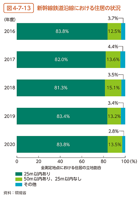 新幹線鉄道騒音に係る環境基準の達成状況は、2020年度において、505地点の測定地点のうち307地点(60.8%)で環境基準を達成しました(図4-7-12)。なお、新幹線鉄道の軌道中心から25m以内に住居がない地域数の割合は、2020年度において16.3%であり、近年ほとんど変わりがありません(図4-7-13)。また、整備新幹線開業時における障害防止対策及び新幹線鉄道振動にかかる指針値は、おおむね達成されています。